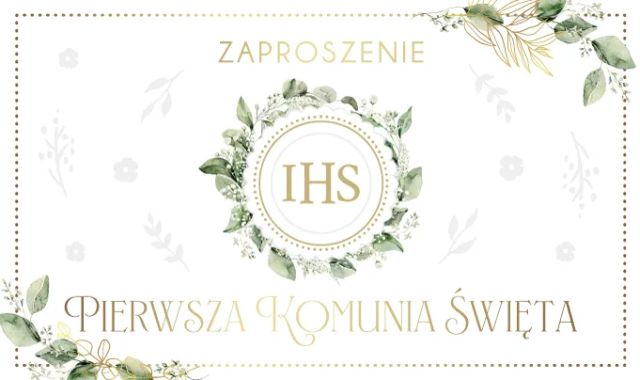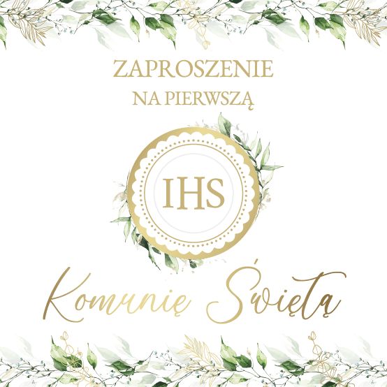 Eleganckie zaproszenia na Pierwszą Komunię Świętą z centralnym symbolem IHS, otoczonym zielonym wieńcem z delikatnych gałązek i liści. Całość uzupełniona jest złotymi... |