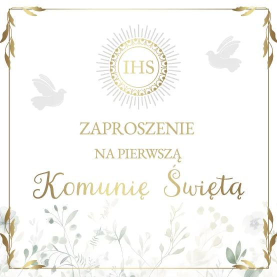 Eleganckie zaproszenia na Pierwszą Komunię Świętą z symbolem IHS, dwiema gołębicami i delikatną, złoconą ramką z roślinnymi zdobieniami. Utrzymane w subtelnej,... |