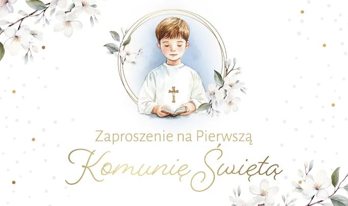 Subtelne zaproszenia na Pierwszą Komunię Świętą z uroczą ilustracją modlącego się chłopca w białej albie z krzyżykiem. Otoczony delikatnymi kwiatami i złoconymi akcentami,... |