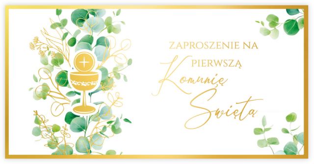 Zaproszenia na Komunię Św. KZK Kw LUX nr.19 KielichZaproszenia na Komunię Świętą – Kielich Złoty i Zielone Gałązki 🌿✨