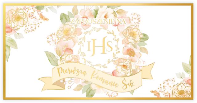 Subtelne zaproszenia na Pierwszą Komunię Świętą z centralnym symbolem IHS, otoczonym złoconym wieńcem i pastelową roślinnością. Elegancka typografia, jasne tło i delikatne... |
