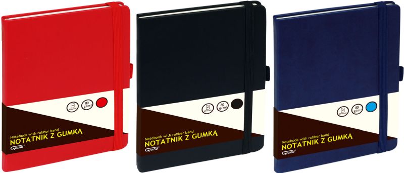 Notatnik GRAND z gumką czarny A5/80 kartek 80gm- kratka czarny/czerwony/granatowy HURT– twarda oprawa – grzbiet szyto-klejony – uchwyt na długopis i wewnętrzna kieszeń – wewnątrz wygodna zakładka – liniatura: kratka – gramatura 80 g/m2 – format A5 – 80 kartek |