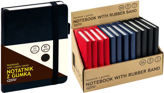 Notatnik z gumką GRAND A5 80k. kratka - czarny– twarda oprawa – grzbiet szyto-klejony – liniatura: kratka – uchwyt na długopis i wewnętrzna kieszeń – wewnątrz notatnika wygodna zakładka – oprawa czarna – gramatura 80 g/m2 –... |