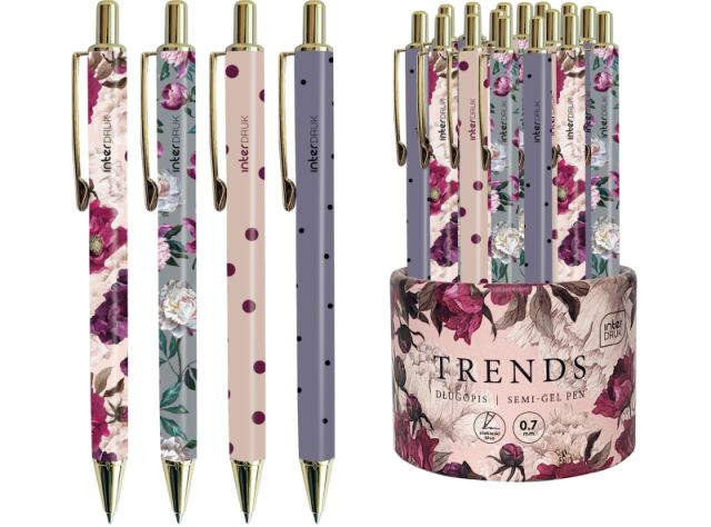 Długopis metalowy INTERDRUK TrendsStylowy długopis, który łączy ze sobą piękno i funkcjonalność. Metalowa, elegancka obudowa. Niebieski wkład żelowo-olejowy. Dostępny w 4 modnych, kobiecych wzorach. 16 szt. w displayu. |
