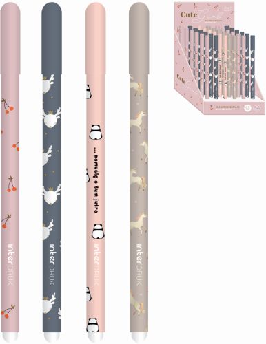Długopis ścieralny INTERDRUK Cute GirlGrubość pisania: 0,5 mm. Zamykany na skuwkę. Niebieski wkład. Zakończony gumką, która umożliwia szybką i estetyczną korektę napisanego tekstu, bez użycia korektora czy przekreślania. Obudowa w 4 słodkich, dziewczęcych wzorach. 36 szt. w displayu. Te... |