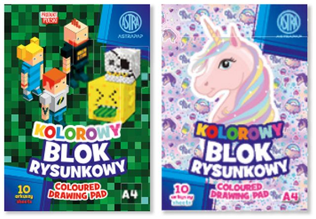 Blok rysunkowy kolorowy A4 10k. 80g ASTRAPAP "PixelxUnicorn"Papier barwiony w masie najwyższej jakości: • niepowlekany, bezdrzewny z delikatnym matowym wykończeniem • gładki z kolorowymi krawędziami • bezkwasowy • do wycinania, rysowania, składania |