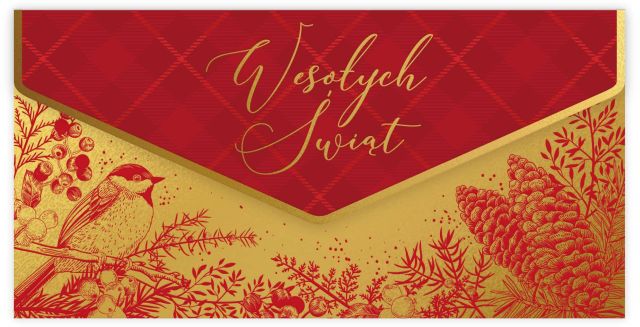 Koperta na pieniądze KZK Boże Narodzenie DL nr.2 Rudzik🎁 Koperta na pieniądze KZK Boże Narodzenie DL Nr 2 – Wesołych Świąt w czerwieni i złocie!