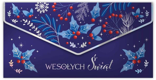 Koperta na pieniądze KZK Boże Narodzenie DL nr.5 Zimowy ostrokrzew💙 Koperta na pieniądze KZK Boże Narodzenie DL Nr 5 – Wesołych Świąt w granacie i srebrze!