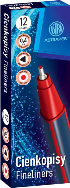 Cienkopis ASTRAPEN trójkątny - czerwonyCienkopisy trójkątne: • przeznaczone do pisania, rysowania i szkicowania • idealne do pracy z szablonami i linijkami • grubość końcówki: 0,4 mm • trójkątny przekrój |