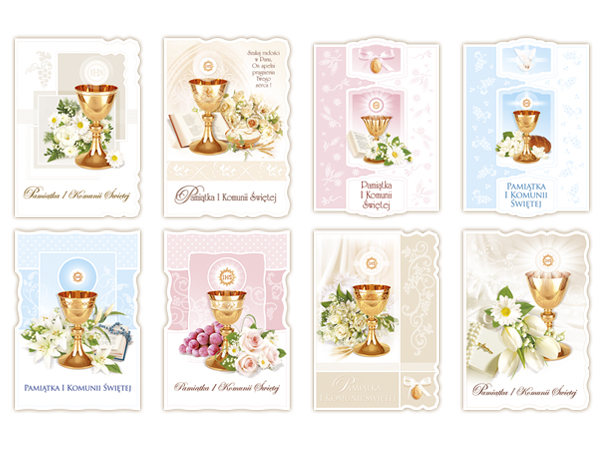 Kartki zaproszenia Komunia Duże - kolor KielichyZaproszenia na I Komunię Św. (95 x 165 mm) Ozdobny wykrojnik, złocenia, tłok, złocony napis Białe koperty, potwierdzenie Opakowanie 10 sztuk ze wzoru |