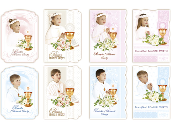 Kartki zaproszenia Komunia Duże - kolor dzieciZaproszenia na I Komunię Św. (95 x 165 mm) Ozdobny wykrojnik, złocenia, tłok, złocony napis Białe koperty, potwierdzenie Opakowanie 10 sztuk ze wzoru |