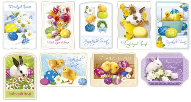 Pocztówka Świecka Brokat WielkanocPocztówki świąteczne Brokat, ozdobny wykrojnik 9 wzorów w opakowaniu 50 szt. mix |