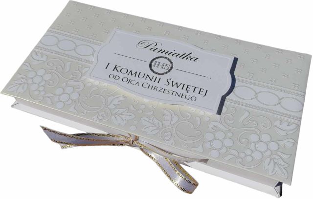 Pudełko na pieniądze satynowe Komunia Św. Ojciec Sw.Pudełka na banknoty z kokardką (165 x 85 x 17 mm) Prezent z okazji I Komunii Świętej Satynowy lakier wybiórczy, ozdobne tłoczenia Kompozycje i napisy ze złotej folii lub srebrnej folii W środku wydrukowany tekst życzeń |