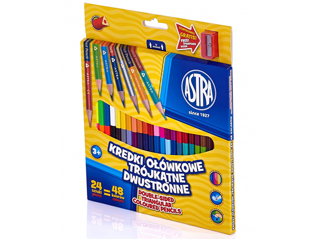 Kredki ołówkowe ASTRA trójkątne dwustronne 24szt/48 kolorów• seria kredek o wyrazistych kolorach • miękkie w użyciu, łatwe w temperowaniu • nie pylą, nie kruszą się • doskonała jakość • dwustronne |
