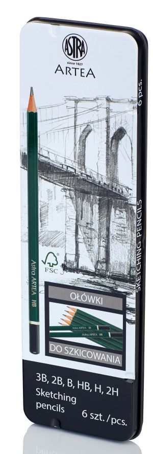 Ołówki grafitowe ASTRA Artea do szkicowania w metalowym pudełku 6szt.• przeznaczone do kreślenia, szkicowania i rysowania • twardość: 3B, 2B, B, HB, H, 2H • certyfikat FSC • hexagonalny kształt |