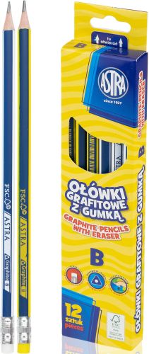 Ołówki grafitowe ASTRA z gumką B• ołówek grafitowy z gumką • mocny i elastyczny grafit odporny na złamania • gwarancja lekkości pisania • trójkątny przekrój prawidłowo kształtujący układ dłoni i ułatwiający naukę pisania |