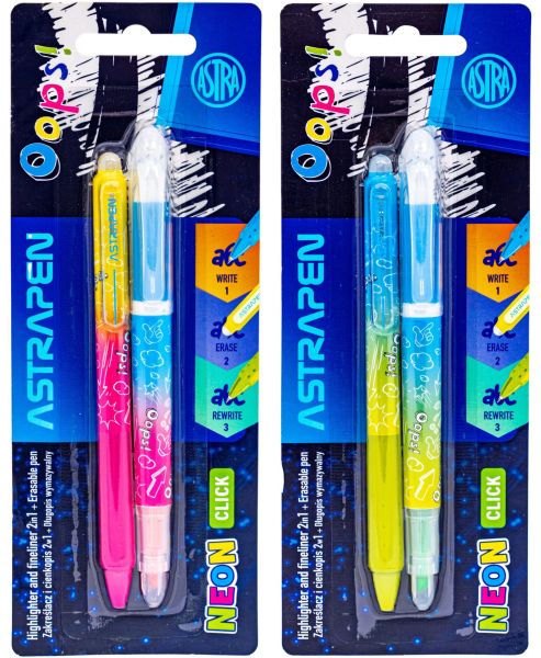 Zakreślacz i cienkopis 2w1 + Długopis wymazywalny CLICK ASTRAPEN Oops! NEON - 2+1 szt. Blister [opakowanie=24szt] |