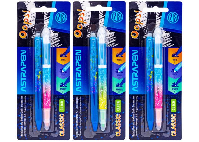 Zakreślacz i cienkopis 2w1 + Długopis wymazywalny CLICK ASTRAPEN Oops! CLASSIC - 2+1 szt. Blister [opakowanie=24szt] |