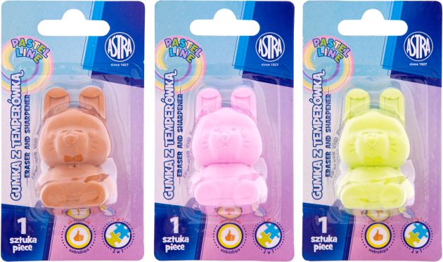 Temperówka i gumka w kształcie króliczka 2w1 ASTRA PASTEL LINE - 1 szt. blister [opakowanie=24szt]• Temperówka i gumka 2w1 • nie narusza struktury papieru • świetna jakość ostrzy • atrakcyjny kształt |