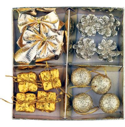 Zestaw świąteczny SGD-01 - 4 bombki, 3 miniprezenty, 3 szyszki, 2 kokardki, 4 sznureczki, kolor złoty |