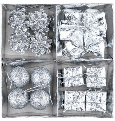 Zestaw świąteczny SGD-02 - 4 bombki, 3 miniprezenty, 3 szyszki, 2 kokardki, 4 sznureczki, kolor srebrny |