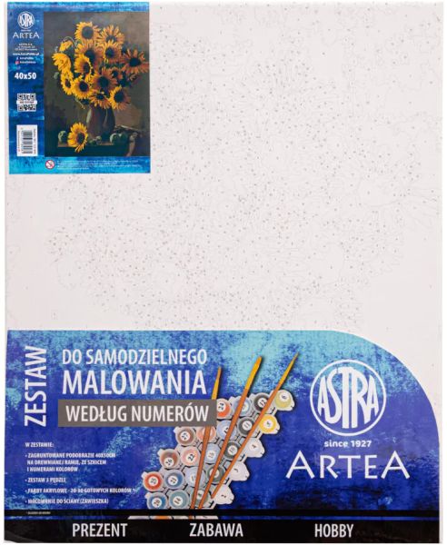 Zestaw z farbami, malowanie wg. numerów, podobr. 40x50cm, Słoneczniki, ARTEA ASTRAPodbrazie z motywem słoneczników to piękna i kolorowa ilustracja o wymiarach 40×50 cm. Przedstawia ona bujne, żółte kwiaty słoneczników, które zdobią dzbanek ustawiony na tle ciemnobrązowej ściany. Kontrast między żółtym kolorem kwiatów a ciemnobrązowym... |
