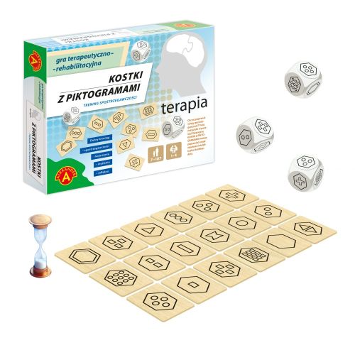 Terapia – Kostki z Piktogramami, ta zabawa ćwicząca koncentrację, spostrzegawczość, poprawiająca zdolności intelektualne. Rozgrywka oparta została na 3 kościach z piktogramami oraz 18 tabliczkach na których znajdują się identyczne piktogramy jak na kościach. Zadanie polega na jak najszybszym odnalezieniu na rozłożonych tabliczkach piktogramu wyrzuconego przez kości. Trzy warianty gry.