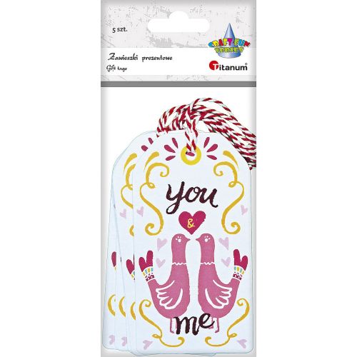 Zawieszki do prezentów wykonane z kartonu. Wymiary zawieszki: 48 x 110 mm. Wzór: gołębie you & me, sznureczek biało-czerwony. Blister 5 szt.