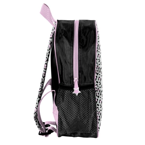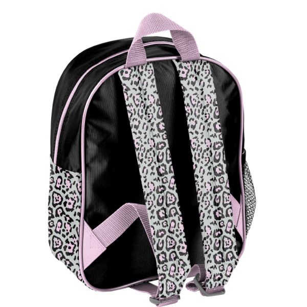 Mały plecak przedszkolny, jedna komora, jedna boczna kieszeń z siatki (mieści małą butelkę, bidon lub termos). Regulowane szelki, wygodny uchwyt do przenoszenia. 28x22x10