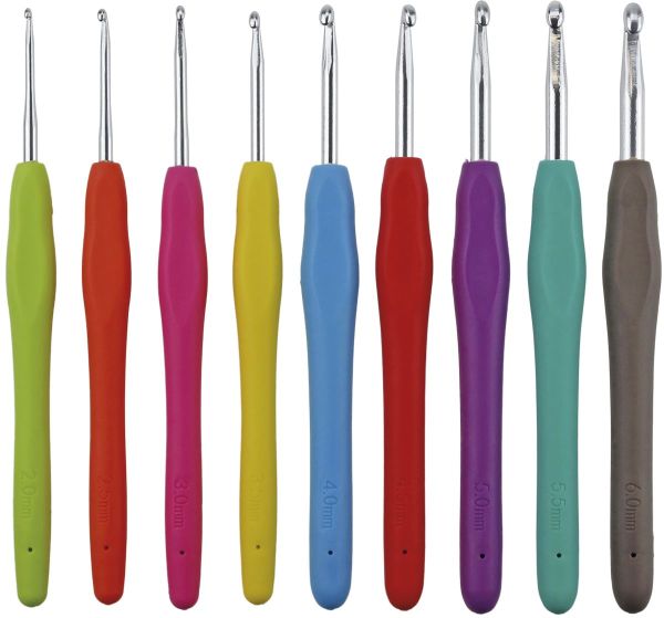 Szydełka metalowe, długość: 160 mm, z silikonowym ergonomicznym uchwytem, zestaw 9 sztuk, rozmiary: 2 / 2,5 / 3 / 3,5 / 4 / 4,5 / 5 / 5,5 / 6, mix kolorów.