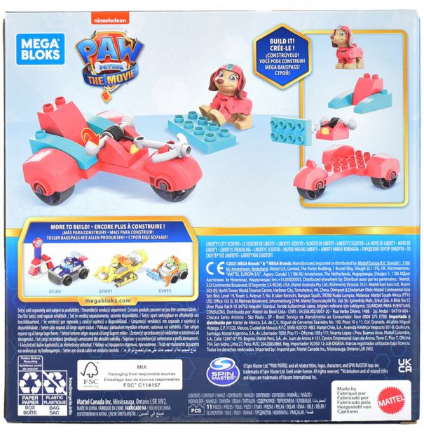 Zestaw konstrukcyjny dużych klocków inspirowany animacją „Psi Patrol”. Zawiera 10 małych, wytrzymałych i charakterystycznych klocków przeznaczonych dla młodszych dzieci oraz dodatkowe elementy specjalne, które pozwalają zbudować Skuter miejski Liberty z hakiem. W zestawie mamy też 1 figurkę Liberty do ustawiania w różnych pozach. Łącznie 11 elementów.