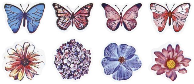 Titanum » Artykuły dekoracyjne całoroczne » Naklejki Dekoracyjne » Naklejki papierowe na taśmie 8 wzorów motyle, kwiaty mix rozmiarów 500szt. szerokość taśmy 28mm