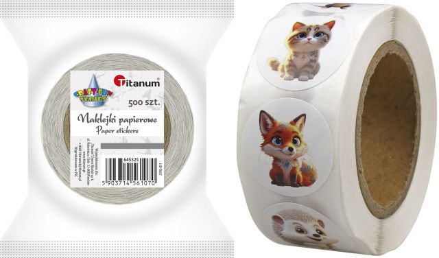 Titanum » Artykuły dekoracyjne całoroczne » Naklejki Dekoracyjne » Naklejki papierowe na taśmie 12 wzorów O25mm słodkie zwierzątka 500szt. szerokość taśmy 28mm