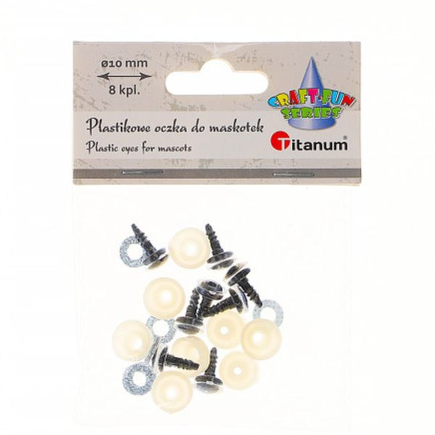 Titanum » Artykuły dekoracyjne całoroczne » Oczka Dekoracyjne » Oczy do maskotek plastikowe O10mm z mocowaniem za pomocą zapinki brokatowe srebrne 8kpl.