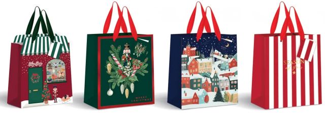 Wykonana z wysokiej jakości papieru 190 g. Eleganckie, matowe wykończenie. Połyskujące detale w technologii hot-stamping. Wzmocniony, sztywny spód. Bilecik z miejscem na życzenia lub imię obdarowywanej osoby. Uchwyty wykonane z atłasowej wstążki. Idealna do szybkiego i efektywnego pakowania świątecznych prezentów. Wymiary: 18x23x10 cm. 4 wzory do wyboru.