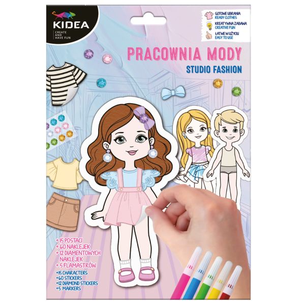 Fascynująca pracownia mody dla małych projektantek - nieskończone możliwości twórczej zabawy z modą i stylem. W opakowaniu znajdziesz 15 postaci to ozdobienia, 60 naklejek z ubraniami,12 diamencików oraz 5 flamastrów.
