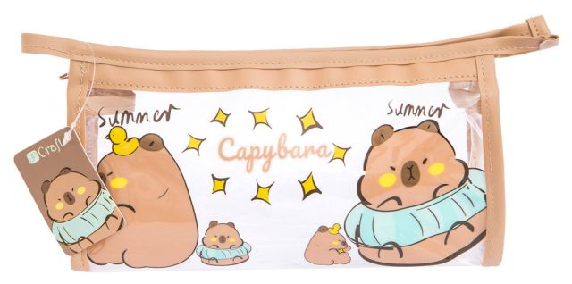 Transparentny piórnik z motywem kapibary o wymiarach 21 x 10,5 x 7 cm. Praktyczny i stylowy, idealny do przechowywania przyborów szkolnych i akcesoriów.