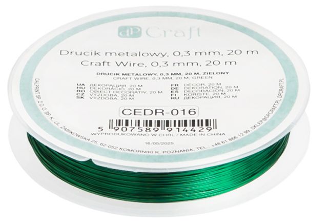 Elastyczny, cienki drucik metalowy w kolorze zielonym, nawinięty na praktyczną szpulkę, stosowany do mocowania i wzmacniania elementów ozdobnych. Przydatny przy tworzeniu biżuterii, elementów i kompozycji wystroju wnętrz oraz projektach florystycznych: bukietach, stroikach oraz wieńcach.