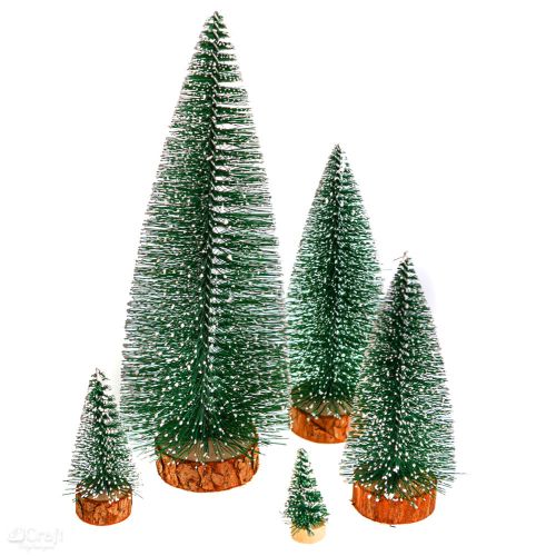 Zestaw dekoracyjnych choinek w różnych rozmiarach, wykone z plastycznego drucika, w kolorze ciemnej zieleni, delikatnie ośnieżone, z drewnianą stópką idealnie sprawdzą się we wszelkich projektach świątecznych.