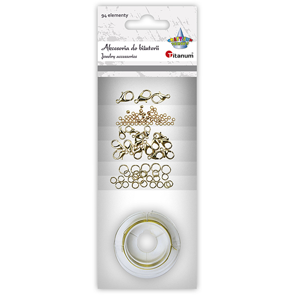 Titanum » Nowości Titanum » Akcesoria do biżuterii 94 elementy złote 50 zacisków o2 mm, 3 zapięcia 14 mm, 10 zapięć 12 mm, 5 zapięć 10 mm, 5 ringów o6 mm, 20 ringów o5 mm, 1 druc