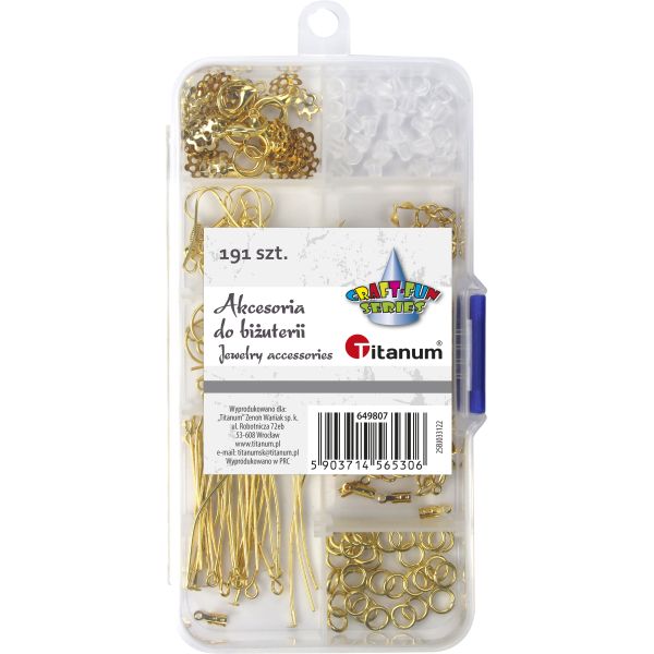 Titanum » Artykuły dekoracyjne całoroczne » Koraliki, Guziki » Akcesoria do biżuterii 191 elementów złote szpilki jubilerskie z łepkiem (gwoździe) 35mm - 15szt., haczyki jubilerskie 35mm - 15szt., bigle zapinane 1