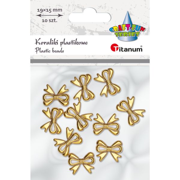 Titanum » Artykuły dekoracyjne całoroczne » Koraliki, Guziki » Koraliki plastikowe kokardki przezroczyste ze złotym wykończeniem 19x15mm (grubość 5mm) dziurka O1mm 10szt.