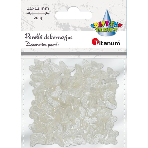 Titanum » Artykuły dekoracyjne całoroczne » Koraliki, Guziki » Koraliki perełki plastikowe motyle 14x11mm dziurka O2mm białe 20g