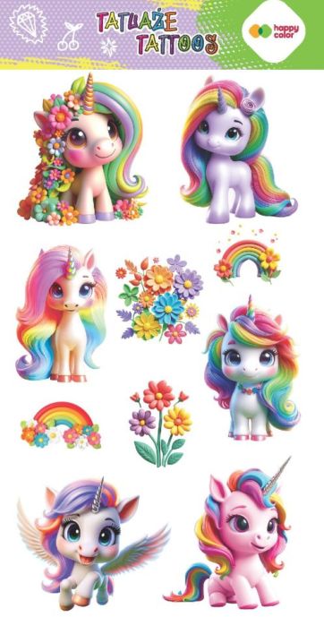 Gdd » Nowości » Tatuaże zmywalne FLOWER UNICORNS, rozm. 100x200 mm, Happy Color [opakowanie=10szt]