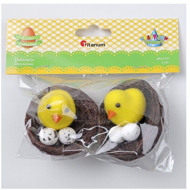 Kury flokowane ¿ó³te z 2 styropianowymi nakrapianymi jajkami w br±zowym gniazdku 4szt. TITWLK26