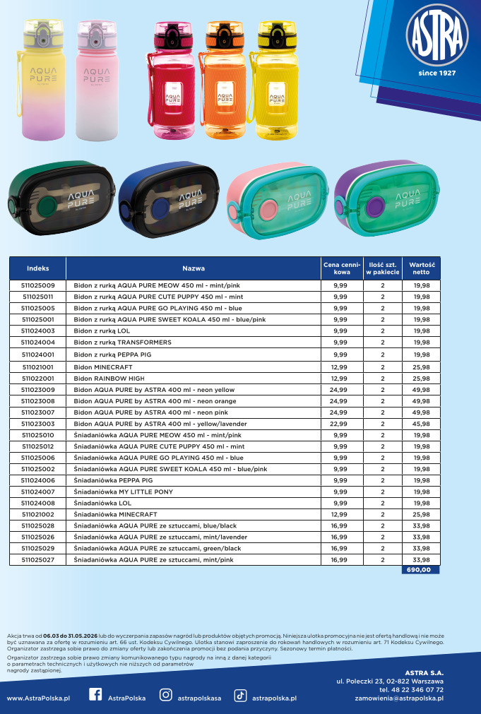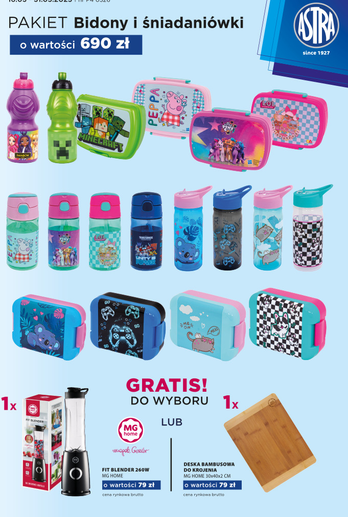 Astra » PAKIETY ASTRA » Pakiet P04 0326 ASTRA Bidony, Śniadaniówki o wartości 690zł + GRATIS: blender lub deska
