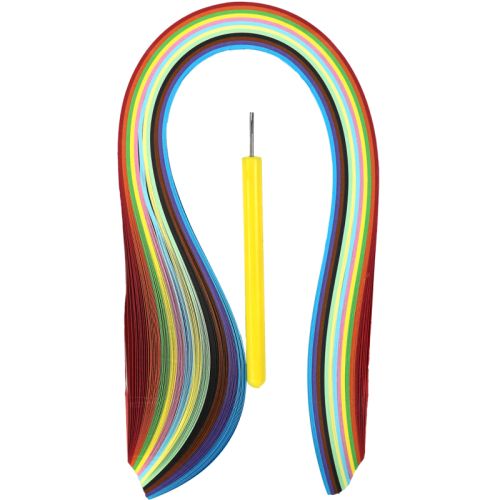 - zestaw składający się z gotowych, dwustronnych pasków w gamie kolorów oraz igły do nawijania pasków w technice quillingu