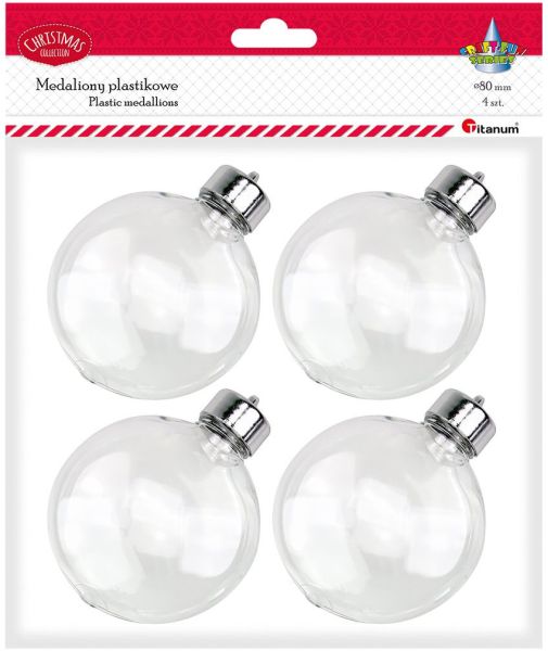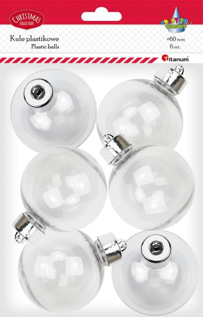 Bombki plastikowe kule O60mm wysokość 78mm ze srebrną zakrętką 6szt.Plastikowe, przezroczyste bombki ze srebrną zakrętką, wygodne do wypełnienia dekoracjami, średnica 60 mm, wysokość 78 mm. 6 sztuk. |