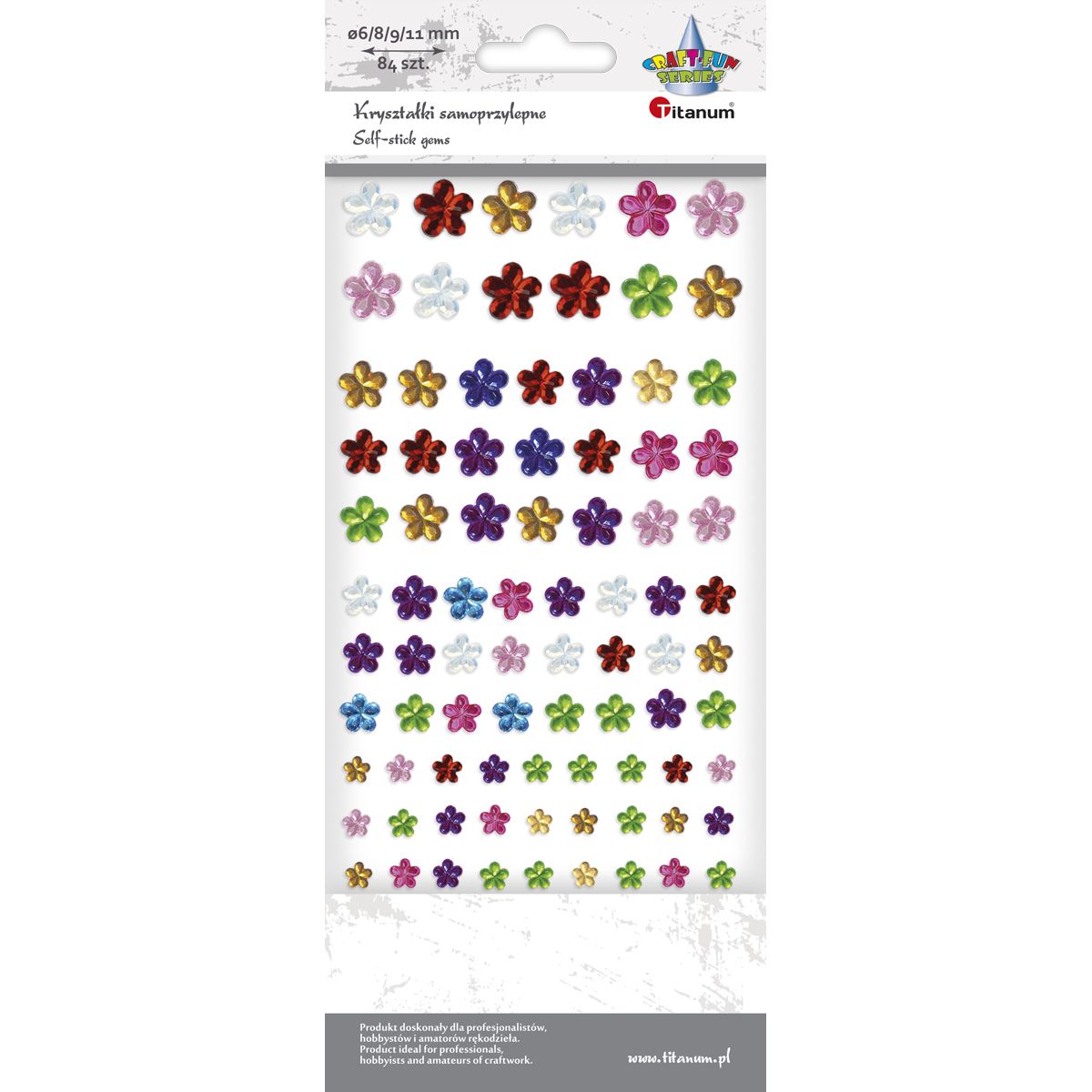 Kryształki samoprzylepne kwiaty mix kolorów 11/9/8/6mm 84szt. TITWLK26Kryształki samoprzylepne. Wzór: kwiaty, mix kolorów i rozmiarów. 84 sztuki. |