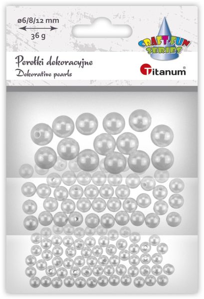 Koraliki plastikowe perełki białe perłowe O12/8/6mm 36gKoraliki plastikowe, perełki, białe perłowe, średnica 6/8/12 mm. 36 g. |